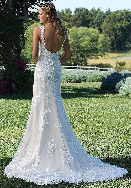 Classy and brimming with elegance, this chic wedding gown is an absolute delight, it features sweetheart neckline with spaghetti straps, adorned with lace appliques and buttons, the natural waist leads to the full-length mermaid silhouette hem with a sweep train, it's sure to impress in your big day.